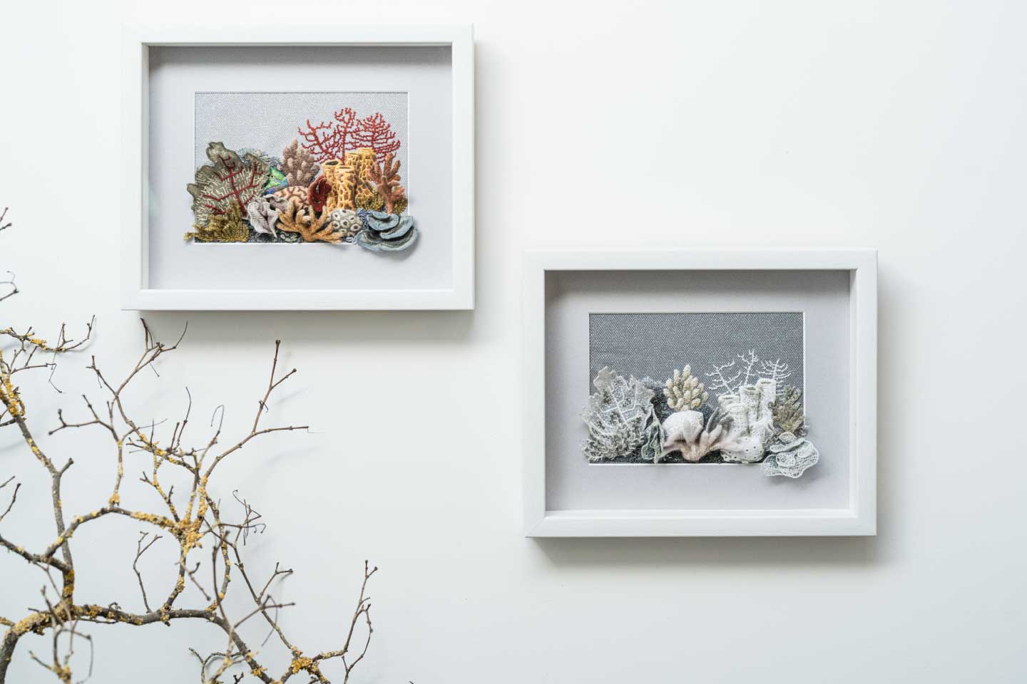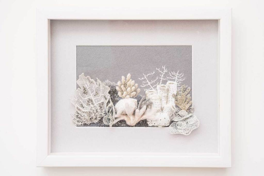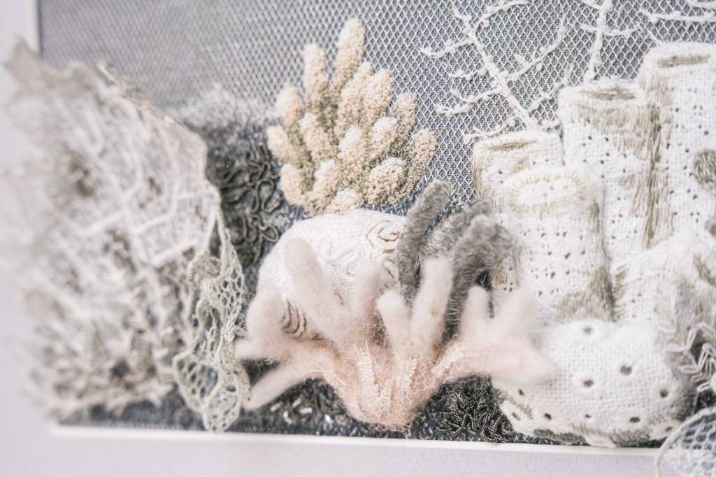 Created for the 2022 Shrewsbury Drapers Company competition, this two-part embroidery piece explores the contrasting states of coral reefs through intricate hand embroidery techniques including stumpwork, whitework, felting, and needle weaving. Part 1: Mother Nature celebrates the vibrant diversity and life of a healthy, thriving reef, while Part 2: Human Nature reflects the devastation caused by climate change, depicting bleached, skeletal coral and environmental decline. Together, the work highlights the delicate balance of marine ecosystems and the profound impact of human activity beneath the waves.