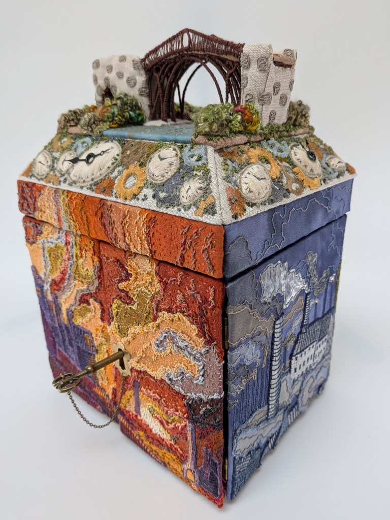 Depicting the birthplace of the Industrial Revolution and it’s legacy, this three-dimensional embroidery challenges the historical devaluation of textile art. Hand embroidery, stump work and appliqué.