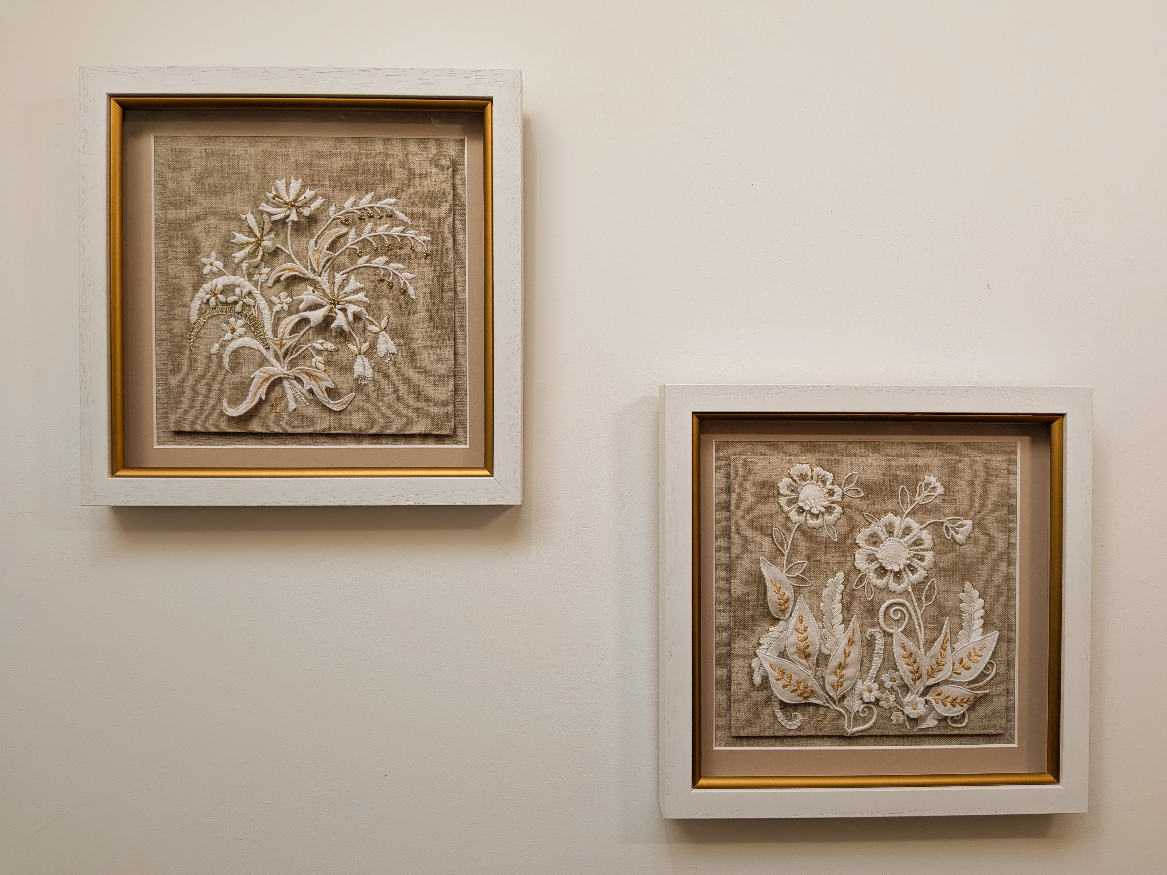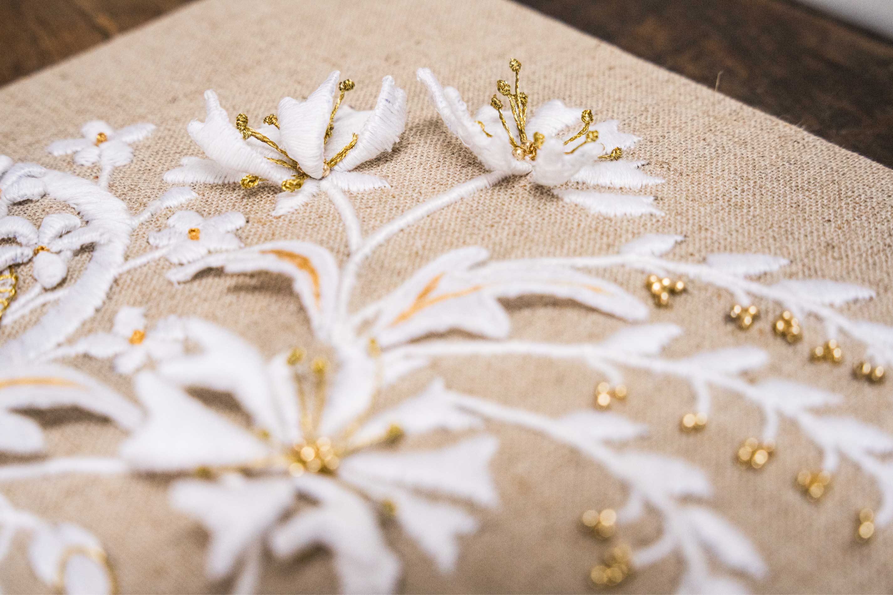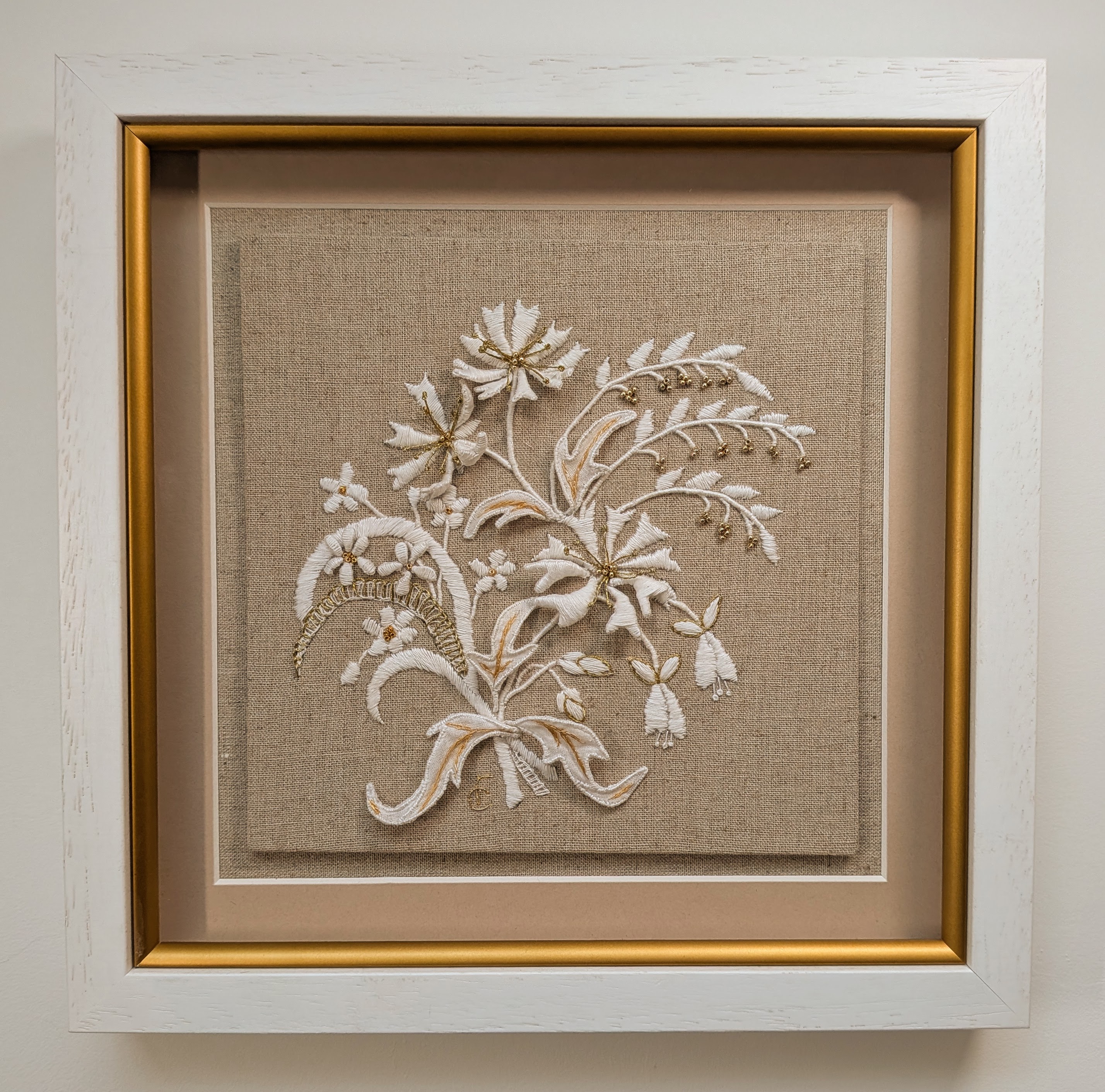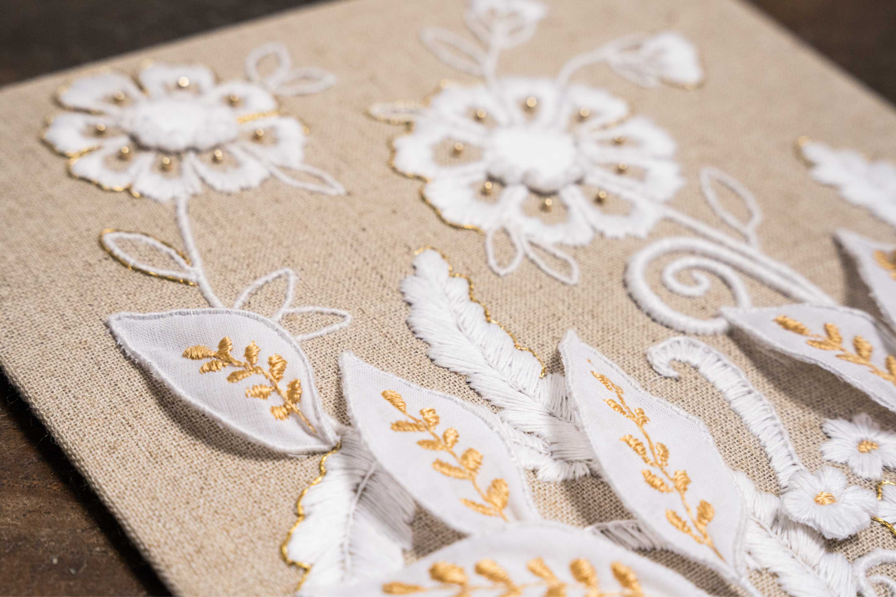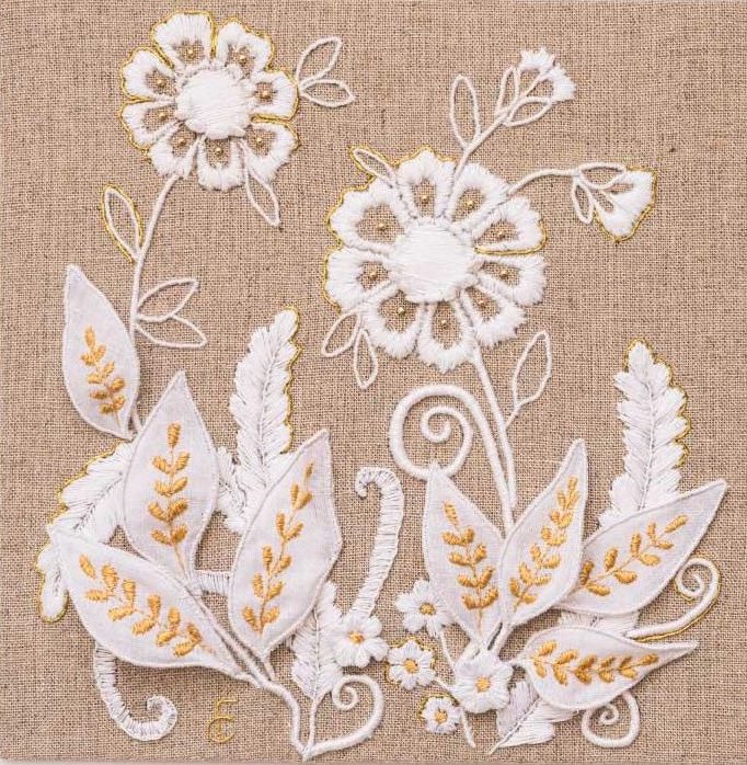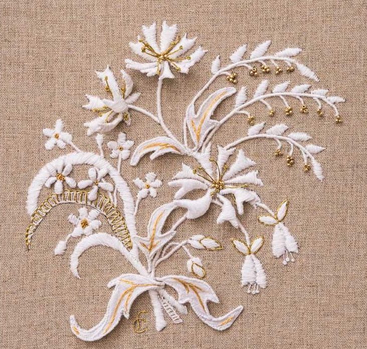 Inspired by traditional lace motifs, this piece combines silk and goldwork embroidery with sculptural, three-dimensional elements to create a timeless design that beautifully complements a contemporary interior. The White and Gold Collection celebrates the artistry of classical hand embroidered needlework while adding depth, texture, and a sophisticated, modern twist.